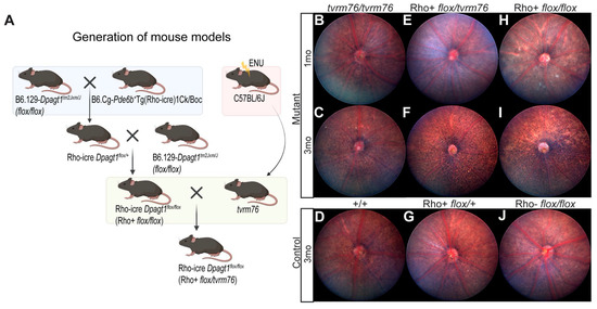 All of the mice involved in this study were bred and housed in the Research Animal Facility at the Jackson Laboratory, and study protocols used in this project were reviewed and approved by the JAX Institutional Animal Care and Use Committee. Male C57BL/6J (B6/J, 000664) were mutagenized (G0) at 10–12 weeks of age by weekly intraperitoneal injections of N-ethylnitrosourea (Sigma-Aldrich, St. Louis, MO, USA) at 70 mg/kg body weight for three consecutive weeks. The G0 mice were mated with unmutagenized female B6/J to produce G1 progeny, which were subsequently mated to female B6/J to produce a G2 population. G2 females were backcrossed to their G1 sires to produce G3 mice, which were screened at 12 weeks for ocular phenotypes by indirect ophthalmoscopy. A G3 male mouse was found to have a fundus with grainy appearance. Because the G3 mouse did not breed, G3 siblings were intercrossed to confirm heritability and establish the line, named tvrm76 (C57BL/6J-Dpagt1tvrm76/Pjn), which showed recessive inheritance. From these initial matings, we determined that both homozygous tvrm76 male and female mice did not breed.