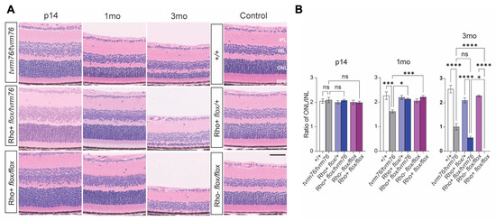 Histological analysis of homozygous Dpagt1tvrm76 and homozygous Rho iCre(+)-Dpagt1flox/flox models shows progressive photoreceptor degeneration in the mid-periphery of the retina. (A) Hematoxylin and eosin (H and E stain) staining of posterior eye sections from Dpagt1tvrm76 homozygotes, compound heterozygotes (Rho+ flox/tvrm76) and homozygous Rho iCre(+)-Dpagt1flox/flox (Rho+ flox/flox) models at postnatal day 14 (p14), one month (1mo), and three months (3mo) and three month littermate controls. (B) Quantification of ONL nuclei degeneration relative to INL. Scale bar = 50 μm. Values represent mean ±SEM; n = 3–6. * p < 0.05; *** p < 0.001; **** p < 0.0001 (one-way ANOVA). IPL: inner plexiform layer; INL: inner nuclear layer; ONL: outer nuclear layer; RPE: retinal pigment epithelium.
