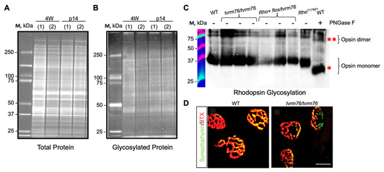 Specific retinal proteins that undergo N-glycosylation include opsin. Opsin glycosylation defects lead to autosomal dominant retinitis pigmentosa [31,32,33]. Since it is conceivable that aberrant opsin glycosylation might contribute to the degenerative retinopathy in homozygous Dpagt1tvrm76 mice, we tested the N-glycosylation status of opsin. The glycosylation pattern of rhodopsin did not differ between mutants and wild-type at one month of age (Figure 4C). To increase the sensitivity of detecting hypomorphic effects of the Dpagttvrm76 allele on the N-linked glycosylation of rhodopsin, rhodopsin glycosylation was measured at two weeks of age in compound heterozygous (Rho iCre(+)-Dpagt1flox/tvrm76) mutants. Retinas from Tg(RHO*T17M)5Asl mice [34] served as a positive control, wherein opsin exhibited an electrophoretic mobility shift of ~1 kDa. Additionally, PNGase-F treated wild-type retinal protein lysate (to enzymatically deglycosylate proteins including opsin) served as a true positive control, wherein opsin exhibits a mobility shift of about 2 kDa, in agreement with previous findings [32]. Again, no difference was noted compared to the homozygous Dpagt1tvrm76 and wild-type controls (Figure 4C).