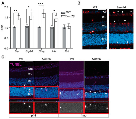 Since our results did not indicate significant defects in protein post-translational modification associated with the Dpagt1tvrm76 variant, we hypothesized that the activation of endoplasmic reticulum stress could mediate the mutation’s pathogenic effects. Defective glycosylation disrupts the normal post-translational modification of proteins and their proper maturation [35]. This disruption can affect the release of the abnormal proteins from the ER and lead to excessive protein accumulation and ER stress [36]. ER stress in turn can induce cell death [37,38,39]. To test if the mechanism underlying the photoreceptor degeneration in Dpagt1tvrm76 eyes might be attributable to a disturbance of ER homeostasis, a panel of ER-stress-associated molecules, including Hsp90b1 (Grp94), Hspa5 (Bip), Ddit3 (Chop), Atf4, and Padi2 (Pdi) were measured at the transcript level by qRT-PCR at two weeks of age, prior to the onset of photoreceptor degeneration (Figure 5A). Notably, Ddit3 was significantly upregulated in whole eyes of two-week-old animals. Hsp90b1 and Hspa5 also showed increased expression relative to wild-type littermate controls.