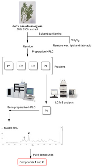Schematic representation of oregonin (1) and 2′-O-acetylsalicortin (2) isolation.