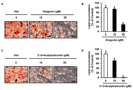 Inhibitory effect of oregonin and 2′-O-acetylsalicortin on intracellular lipid contents. The 3T3-L1 preadipocytes were induced to differentiate and then treated with oregonin. (A) After differentiation, Veh or oregonin (10 or 50 µM)-treated cells were stained with Oil Red. (B) Lipid contents were quantified by spectrophotometry (n = 3 per group). (C) Veh or 2′-O-acetylsalicortin (10 or 50 µM)-treated cells were stained with Oil Red O solution. (D) Intracellular lipid accumulation was analyzed by spectrophotometry (n = 3 per group). The values indicate the mean ± SEM. Mean values followed by different letters are significantly different (p ≤ 0.05). The size of each scale bar in photomicrographs is 100 µm. Veh, vehicle treatment (negative control).