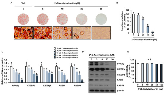 Inhibitory effect of 2′-O-acetylsalicortin on adipogenesis. (A) 3T3-L1 cells treated with various concentrations of 2′-O-acetylsalicortin during the adipocyte differentiation were stained with Oil Red O (upper) and analyzed by microscopy (bottom). (B) Quantification of intracellular lipid contents with spectrophotometry (n = 3 per group). (C) Expressions of PPARγ, FABP4, FASN, C/EBPα, and C/EBPβ genes were examined using qRT-PCR (n = 3 per group). (D) Protein levels of C/EBPβ, FASN, FABP4, C/EBPα, and PPARγ were analyzed by immunoblotting. (E) Cytotoxic effect of 2′-O-acetylsalicortin (n = 3 per group). The values represent the mean ± SEM. The size of each scale bar in photomicrographs is 100 µm. Mean values followed by different letters are significantly different (p ≤ 0.05). N.S., not significant. Veh, vehicle treatment (negative control).