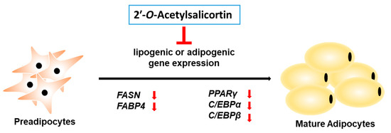 For a long period, plants have been traditionally utilized to prevent or treat obesity, and several bioactive compounds from edible plants have been isolated for the development and discovery of novel anti-obesity drugs [30]. Plant-derived molecules, such as cellatrol and wedaferrin A, improve leptin sensitivity, leading to weight loss [31,32]. Many medicinal plants and their bioactive compounds have been clinically tested and recognized as effective drug candidates for treating obesity and type 2 diabetes [33]. For example, Rhinacanthus nasutus (L.) Kurz (Acanthaceae), a common medicinal herb found in Thailand and Southeast Asia, has been traditionally used to treat type 2 diabetes because it has displayed anti-adipogenic, anti-hyperglycemic, and anti-hyperlipidemic effects [34,35,36]. In addition, among all such plants, the genus Salix has been identified as a crucial medicinal herb because it shows important anti-inflammatory activities due to the presence of salicin, which is a precursor of acetylsalicylic acid [9,37]. They also show anti-cancer, antidiabetic, antioxidant, anti-inflammatory, antimicrobial, hepatoprotective, and neuroprotective activities [38]. In addition, the MeOH extract of S. pseudolasiogyne was determined to display a cognitive-enhancing effect on scopolamine-induced memory deficit in mice, and it reduced glutathione reductase activity [9]. Moreover, 2′-O-acetylsalicortin from this MeOH extract showed an anti-amnesic activity through a significant reversal of the reduced antioxidant activities of enzymes, such as superoxide dismutase, glutathione peroxidase, glutathione reductase, and glutathione content [9]. The current study elucidated that 2′-O-acetylsalicortin suppressed the development of preadipocytes into mature adipocytes by reducing the levels of mRNAs and proteins affecting lipogenesis and adipogenesis (Figure 5). Therefore, our results suggest that 2′-O-acetylsalicortin, a natural bioactive product, can be a potent drug candidate for the prevention and treatment of obesity.