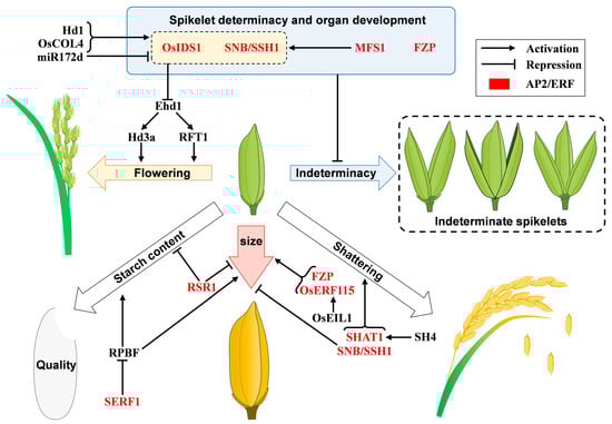 Schematic representation of spikelet development, flowering time and grain properties mediated by AP2/ERF transcription factors in rice. OsIDS1, SNB/SSH1, MFS1 and FZP, which are mentioned in Section 3.1, inhibit spikelet indeterminacy. Of these, OsIDS1 and SNB/SSH1 are mentioned in Section 3.2 to inhibit flowering. In Section 3.3, SHAT1 and SNB/SSH1 are mentioned to promote grain shattering. FZP and OsERF115 promote grain size, while SNB/SSH1, RSR1 and SERF1 inhibit grain size. SERF1 inhibits starch content, and RSR1 affect amylose content and amylopectin structure. The AP2/ERF transcription factors and other regulators are shown in red and black, respectively.