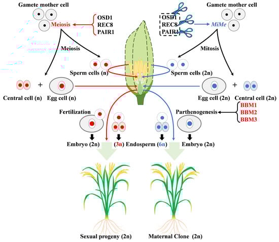 Schematic representation of sexual reproduction and synthetic apomixis regulated by MiMe and BBMs in rice. The genes in this figure are described in Section 3.4. Left is the sexual reproduction process in which the germ cells form haploid gametes through processes such as meiosis and double fertilization that produce a diploid (2n) embryo and a triploid (3n) endosperm. Apomixis on the right consists of two main modifications: one is the knockdown of OSD1, REC8 and PAIR1, which converts meiosis into mitosis (a technique called MiMe), resulting in 2n egg, sperm cells and central cells. The second is parthenogenesis induced by BBMs (AP2/ERF transcription factors), which converts (2n) egg cells into embryos and produces (6n) endosperm.
