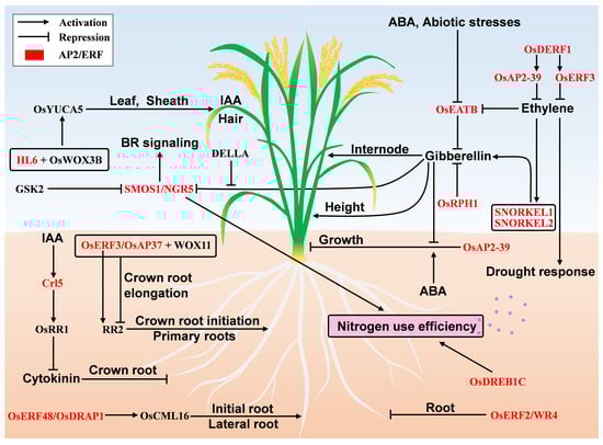 Schematic representation of development, phytohormones and nutrient use efficiency regulation mediated by AP2/ERF transcription factors in rice. In Section 3.5, OsERF3/OsAP37, Crl5 and OsERF48/OsDRAP1 are described as affecting root initiation and formation. In Section 3.6, HL6, OsEATB, OsERF2/WR4, OsRPH1, SMOS1/NGR5, SNORKEL1, SNORKEL2, OsDERF1, OsAP2-39 and OsERF3 are described to regulate various growth processes of plants by participating in phytohormone pathways. SMOS1/NGR5 and OsDREB1C promote rice nitrogen use efficiency, as described in Section 3.7. The AP2/ERF transcription factors and other regulators are shown in red and black, respectively. Abbreviations: indole-3-acetic acid, IAA; abscisic acid, ABA; gibberellin, GA; brassinosteroid, BR.