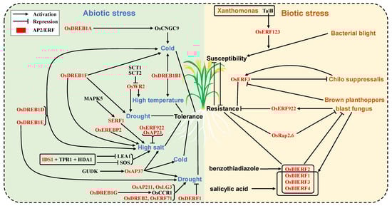 Schematic representation of AP2/ERF transcription factors involved in abiotic and biotic stress regulation in rice. Left are the AP2/ERF regulatory networks of cold, high temperature, high salt and drought tolerance in rice; these factors are discussed in Section 3.8.1. OsDREB1A/D/E/F, OsDREB1BI and OsAP37 promote rice cold tolerance. OsDREB1BI and OsWR2 promote rice high temperature tolerance. OsDREB1E/F/G, OsDREB2, OsWR2, OsAP37, OsAP211, OsLG3 and OsERF71 promote rice drought tolerance, while OsDERF1 inhibits drought tolerance. OsDREB1D/E/F, SERF1, OsEREBP2, OsAP37 and IDS1 promote rice high salt tolerance, while OsERF922 and OsAP23 inhibit high salt tolerance. On the right, AP2/ERF genes participate in the regulation of disease and insect resistance in rice; these factors are discussed in Section 3.8.2. TalB, which is a transcriptional activator effector in Xanthomonas, promotes rice susceptibility to bacterial blight fungus X11-5A by promoting OsERF123. OsERF3 is activated by Chilo suppressalis attack, which improves rice resistance against chewing herbivores but is slightly suppressed by brown planthoppers attack. OsRap2.6 promotes rice blast fungus resistance, while OsERF922 inhibits rice blast fungus resistance. OsBIERF1/2/3/4 is involved in the rice blast defense response, and among them OsBIERF1/2/3/4 can be induced by benzothiadiazole, and OsBIERF1/3/4 can be induced by salicylic acid and blast fungus. The AP2/ERF transcription factors and other regulators are shown in red and black, respectively.