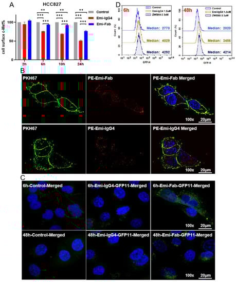 For the detection of cell surface c-MET, cells were plated in duplicates into 6-well plates and treated with either Emi-IgG4 or Emi-Fab. Cells were subsequently harvested using enzyme-free dissociation solution (Gibco, Life Technologies, Carlsbad, CA, USA) at different time points and labeled with FITC-anti-c-MET antibody (Thermo Fisher Scientific, MA, USA), which recognized a separate MET epitope from Emi-IgG4, at 4°C for 30 min, and the cells expressing membrane c-MET were quantified using flow cytometry (Agilent Technologies, Santa Clara, CA, USA). For detecting the GFP expression in HCC827-GFP1-10 cells, cells were cultured overnight and incubated with either Emi-Fab-GFP11 (3 µM) or Emi-IgG4-GFP11 (1.5 µM) for 6 h or 44 h, respectively. Cells were then harvested and analyzed using a flow cytometer to determine the GFP-expressing cell count.