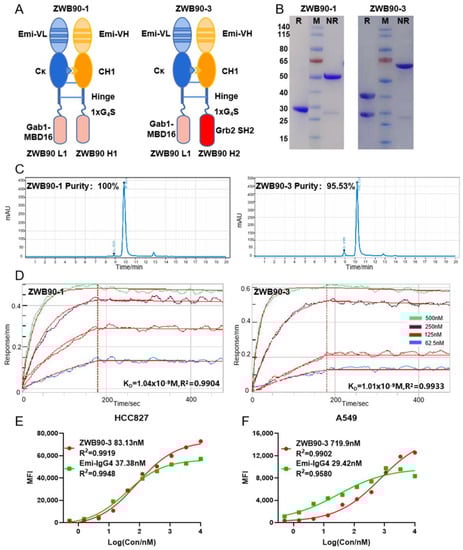Generation and identification of ZWB90-1 and ZWB90-3. (A) Schematic representation of the design of ZWB90-1 and ZWB90-3. (B) Purities and molecular weights of ZWB90-1 and ZWB90-3 were detected by staining with Coomassie brilliant blue. Data showed expected band sizes and satisfactory purity levels. (C) The purities of ZWB90-1 and ZWB90-3 were also confirmed using the SEC. (D) ForteBio Octet determination of the affinities of ZWB90-1 and ZWB90-3 toward c-MET. The binding affinity parameter KD was calculated, as reported by ForteBio Data Analysis Software 8.0 (Fremont, CA, USA). (E,F) Dose-dependent binding of ZWB90-3 and Emi-IgG4 in HCC827 cells and A549 cells. The avidities were calculated using a four-parameter logistic curve analysis with GraphPad software (San Diego, CA, USA). R2 is the coefficient of determination for estimating the goodness of the curve fit.