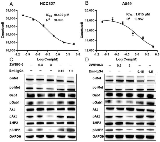 Effects of ZWB90-3 on the inhibition of cell proliferation and downstream signaling. (A,B) The IC50 values were calculated using a four-parameter logistic curve in HCC827 and A549 cells, respectively. (C,D) Western blot (WB) analysis of c-MET, p-c-MET, Gab1, p-Gab1, AKT, p-AKT, SHP2, and p-SHP2 expression levels in HCC827 and A549 cells, respectively.