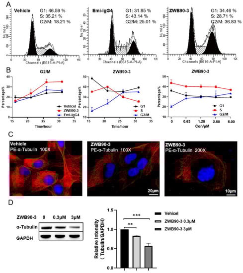 ZWB90-3-induced G2/M-phase arrest and interference in the microtubule arrangement. (A) HCC827 cells were treated with PBS (vehicle) or ZWB90-3 or Emi-IgG4 for 26 h, and total DNA contents were analyzed using flow cytometry. Numbers within the boxes are proportions to the G0/G1, S, and G2/M phases. (B) The curve of the change over time between groups in the G2/M phase (left). The time-course curve of the ZWB90-3-induced G2/M-phase arrest (middle). The dose–response curve of ZWB90-3-induced G2/M-phase arrest (right). (C) Immunofluorescence (IF) staining of α-tubulin in the vehicle and ZWB90-3-induced cells. Images were acquired at 100× or 200× magnification. Scale bars: 20 μm or 10 μm. (D) Western blot images, where α-tubulin and GAPDH served as the loading controls. ** p < 0.01 and *** p < 0.001 were considered significant as compared to the vehicle control.