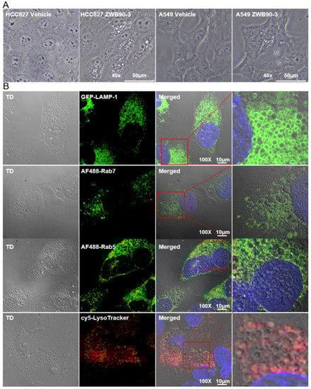 ZWB90-3-induced large vacuole formation in HCC827 and A549 cells. (A) Phase contrast images were taken after 72 h of ZWB90-3 or PBS treatment (vehicle) in HCC827 and A549 cells. Images were acquired at 40× magnification. Scale bars: 50 μm. (B) HCC827 cells were treated with ZWB90-3 to induce vacuole formation. Confocal imaging was used to co-localize GFP-LAMP1, AF488-Rab7, AF488-Rab5, and cy5-LysoTracker. Images were acquired at 100× magnification. Scale bars: 10 μm.