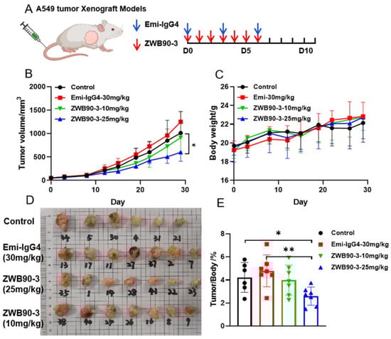 Anti-tumor effects of ZWB90-3 in the A549 NSCLC xenograft mouse model. (A) Drug administration scheme. (B) Mice were intravenously injected with 10 mg/kg and 25 mg/kg doses of ZWB90-3, and the two control groups were treated with PBS or 30 mg/kg of Emi-IgG4. A total of seven mice per group was used for the study. * p < 0.05 was considered significant as compared to the vehicle control. (C) Mice body weight curve. (D) Tumor tissues were dissected and photographed. (E) Tumors were weighed and the tumor-to-body weight ratio was calculated. * p < 0.05 was considered significant as compared to the vehicle control. ** p < 0.01 was considered significant as compared to Emi-IgG4 group.