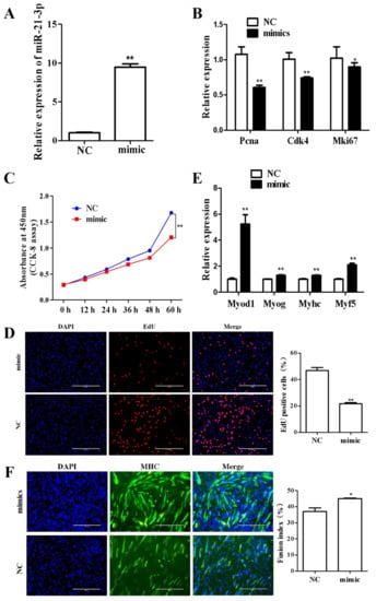 2.8. MiR-21-3p Inhibits C2C12 Cell Proliferation and Promotes Differentiation