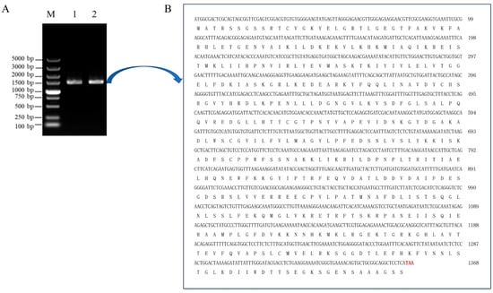 Cloning of the CDS sequence of GhCIPK23 gene in upland cotton. (A) Agarose gel electrophoretic analysis of PCR amplification product of GhCIPK23 gene; 1 and 2: Target gene; M: DNA marker (DL5000). (B) The CDS sequence of GhCIPK23 and its encoded protein by sequencing. the red base represents the stop codon.