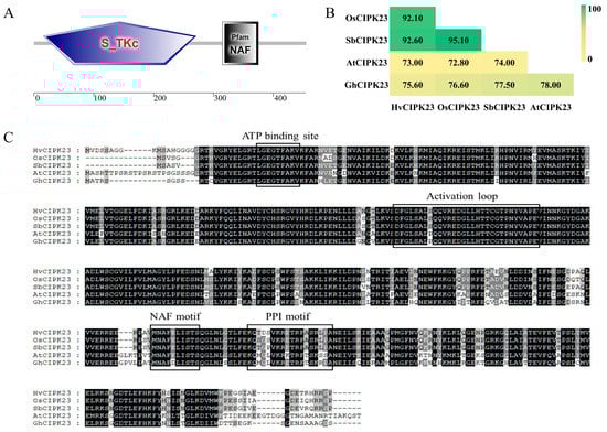 Domain and sequence identity analysis of GhCIPK23 protein in upland cotton. (A) Protein domain prediction of GhCIPK23. (B) Protein sequence identity analysis of GhCIPK23 and CIPK23 protein of other species. (C) Amino acid sequence alignment of GhCIPK23 and CIPK23 protein of other species.