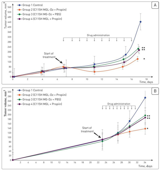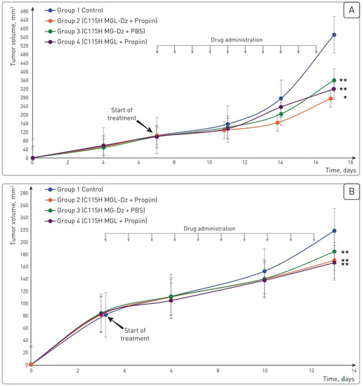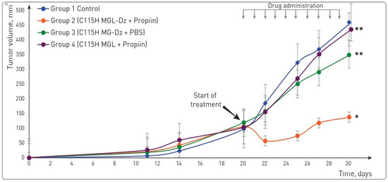 Ref. [34], the lag in tumor growth was used to evaluate treatment response. Growth curves were constructed using the average tumor volumes within each experimental group. The anticancer efficacy of C115H MGL-Dz with propiin in situ or other therapeutic groups was calculated using tumor growth inhibition (TGI %), using the formula:
