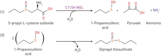 In total, 20 mg/mL of propiin was dissolved in 50 mM of potassium phosphate buffer, pH 7.0, containing 0.1 mM PLP, then combined with C115H MGL (0.14 U/mL) and incubated at 37 °C for 1 h. The NTB assay was used to quantify the concentration of thiosulfinate produced in the reaction mixture [28].