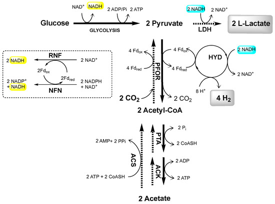 Recently, we reported a new pathway named capnophilic lactic fermentation (CLF) in Thermotoga neapolitana (Figure 1) [10]. Under CO2 atmosphere, CLF enables the non-competitive synthesis of L-lactic acid and hydrogen at the same time. Besides a classic catabolic branch from sugars to acetate, the pathway also has an anabolic branch from acetyl-CoA to lactate, enabled by sequential actions of pyruvate:ferredoxin oxidoreductase (PFOR) and lactate dehydrogenase (LDH) [10,11,12,13,14]. To support the concomitant production of hydrogen and lactic acid, the additional NADH requirement is likely satisfied by a CO2-induced metabolic process involving NAD-Ferredoxin oxidoreductase (RNF) and NADH-dependent reduced ferredoxin:NADP oxidoreductase (NFN) [9,14,15,16].