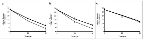 Glucose consumption of Tnea (a), Trq7 (b), and Tmar (c) after 24 and 48 h, under N2 (black bars) and CO2 (gray bars) conditions. Asterisks indicate significant differences: *, p ≤ 0.05; **, p ≤ 0.001.