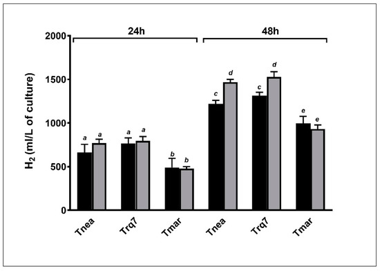 For hydrogen production, all strains exhibited no significant differences between N2 and CO2 sparging after either 24 or 48 h (Figure 3). Total hydrogen production was lower in Tmar compared to the other two strains, parallel to the lower consumption of glucose.