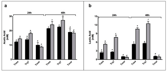 Acetic acid and lactic acid are the main organic end products in sugar fermentation by Thermotogales [3,8,23]. Interestingly, CO2 did not affect acetate production in any strains compared to N2 sparging, at either 24 or 48 h (Figure 4a). In Tnea and Trq7, CO2 insufflation doubled the lactate level at both 24 and 48 h, whereas in Tmar, no significant difference in lactate levels was observed at either time point (Figure 4b).