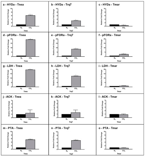 Gene expression levels of HYD (CTN_RS05285 (a–c)), PFOR (CTN_RS03385 (d–f)), LDH (CTN_RS03950 (g–i)), ACK (CTN_RS02020 (j–l)), and PTA (CTN_RS07210 (m–o)) after 24 h under N2 (black bars) and CO2 (gray bars) conditions in Tnea, Trq7 and Tmar. Variations are indicated as relative fold changes in CO2 with respect to N2. mRNA levels were calculated relative to the expression of 16S RNA. Asterisks indicate significantly different values at p ≤ 0.05 (*).
