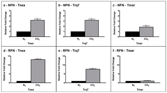 Gene expression levels of NFN (CTN_RS04020 (a–c)) and RFN (CTN_RS02165 (d–f)) under N2 (black bars) and CO2 (gray bars) conditions Tnea, Trq7 and Tmar. Variations are indicated as relative fold changes in CO2 with respect to N2. mRNA levels were calculated relative to the expression of 16S RNA. Asterisks indicate significantly different values at p ≤ 0.05 (*).