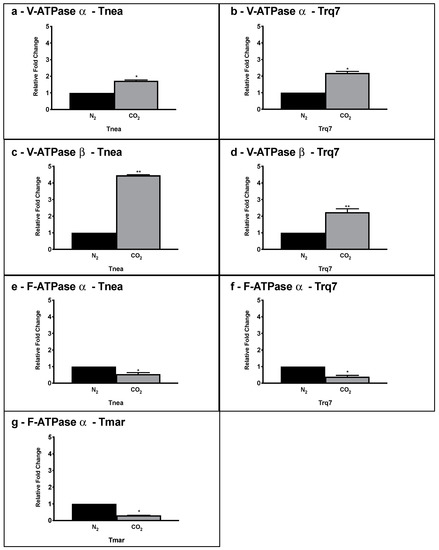 Gene expression levels of V-ATPase subunitα (a,b) V-ATPase subunit β (c,d), and F-ATPase subunitα (e–g), in Tnea, Trq7, and Tmar under N2 (black bars) and CO2 (gray bars) conditions, measured by qRT-PCR. Variations are indicated as relative fold changes in CO2 with respect to N2. mRNA levels were calculated relatively to the expression of 16S RNA. Asterisks indicate significantly different values at p ≤ 0.05 (*) and p ≤ 0.001 (**).