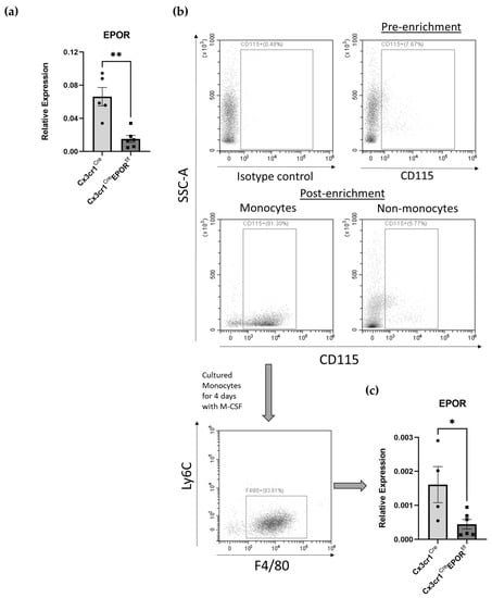Confirmation of the conditional knockout of EPOR expression in the monocytic lineage in the Cx3cr1CreEPORf/f mice. (a) EPOR expression as measured by RT-qPCR in freshly isolated bone-marrow-derived CD115+ cells from Cx3cr1CreEPORf/f mice and their controls. Expression of EPOR was normalized to HPRT. n = 5–6 mice in each group. ** p < 0.01 vs. Cx3cr1Cre. (b) Flow cytometry analysis of freshly isolated BM monocytes after 4 days culture with M-CSF to generate BMDM in vitro. (c) EPOR expression as measured by RT-qPCR in BMDM as in (b) from Cx3cr1CreEPORf/f mice and their controls. Expression of EPOR was normalized to HPRT. n = 4–6 mice in each group. * p < 0.05 vs. Cx3cr1Cre. All data are mean ± SEM. p values calculated by a Student’s t-test.