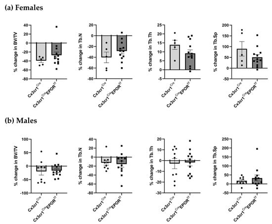 The extent of the BV/TV reduction induced by EPO in females tended to be lower in the Cx3cr1Cre EPORf/f mice than in the controls (27.05% vs. 39.26% reduction, respectively, Figure 4a). Although this difference in the response to EPO did not reach statistical significance, it may imply an involvement of EPOR in preosteoclasts in mediating the bone loss induced by EPO.