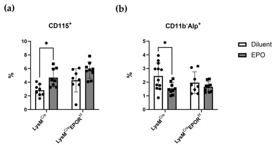 Confirmation of the conditional deletion of EPOR expression in the monocytic lineage of LysMCreEPORf/f mice. EPOR expression, as measured by RT-qPCR in bone-marrow-derived CD115+ and CD115− cells from female LysMCreEPORf/f mice and their controls. Expression of EPOR was normalized to GAPDH. n = 2–3 mice in each group. * p < 0.05 versus LysMCre. All data are mean ± SD. p values were calculated by 2-way ANOVA.