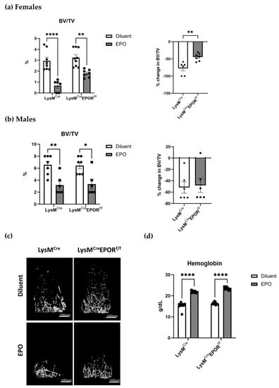 Our results reveal that the conditional deletion of EPOR did not affect the trabecular bone parameters in both males and females (diluent-treated LysMCre and LysMCre EPORf/f, Figure 8a,b), suggesting that EPOR signaling in preosteoclasts does not play significant roles under steady-state conditions. EPO treatment significantly lowered the bone density in the trabeculae of both LysMCre (control) and LysMCreEPORf/f male and female mice, and in males, the skeletal response to EPO was similar in the control and knockout mice (51.81% and 48.15% reduction, respectively, Figure 8b). However, the extent of bone loss induced by a high EPO dose in female mice with an EPOR deletion in the monocytic lineage (LysMCreEPORf/f) was significantly lower than that in the controls (44.46% versus 77.28% reduction, respectively, p = 0.002, Figure 8a). Importantly, despite the dramatic skeletal effects, erythropoiesis was unaffected by the conditional deletion of EPOR, as demonstrated by the EPO-induced increase in hemoglobin (Figure 8d).