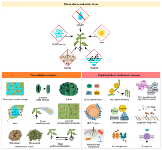 Plants often have to adapt to environments that are unfavorable for growth and development. Some plants acquired adaptive traits during evolution to deal with extreme environments, such as deserts, tundra, or swamps. To withstand these harsh environmental conditions, plants developed morphological and physiological adaptations, as well as signaling pathways that elicit biochemical and molecular mechanisms to survive different stress conditions [8]. The stressful environmental factors can be either biotic or abiotic. Abiotic stresses mainly include drought, salinity, extreme temperatures, flooding, oxidative stress, nutrient deficiencies, and heavy metal stress [9]. Drought is the major cause of crop losses around the world and water provision for agriculture was a key element for civilization’s success [10,11]. Drought, salinity, cold, and freezing induce osmotic and oxidative stress and increase intracellular ion concentration, thus leading to reactive oxygen species (ROS) accumulation, protein denaturation, membrane disruption, and nucleic acid damage (Figure 1).