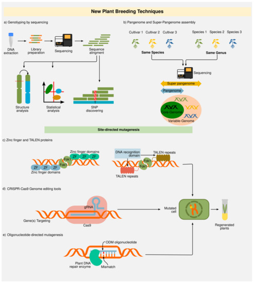 New plant breeding techniques. (a) Genotyping by sequencing. This method allows simultaneous analysis of large numbers of DNA samples using restriction enzymes to decrease genome complexity and generate thousads of SNP-like markers (one-base polymorphisms) using sequencing platforms. (b) Pangenome and super pangenome assembly. Describes the collection of all genes in a species (pangenome) or genus (super pangenome). These have a nucleus genome that has all the genes shared by a species and the variable genome that only some individuals have. (c) Zinc finger and TALEN site direct mutagenesis. Zinc finger nucleases are constituted by the fusion of series of zinc finger domains with a non-specific domain of the FokI nuclease. Each zinc finger domain recognizes three nucleotides while the FokI domain cuts DNA strands at different positions, introducing a sticky double strand break (DSB) (5–7 bp). Transcription activator-like effector nucleases (TALENs) are TALE repeats with a non-specific FokI endonuclease domain. Each TALE repeat recognizes a single nucleotide, while the FokI domain introduces sticky DSB within the spacer sequence (12–21 bp). (d) CRISPR-Cas9 genome editing tools. The system consists of a single guide RNA and Cas9 endonuclease. Guide RNA pairs with 20-nucleotide target sequences in genomic DNA, and the Cas9 enzyme contains catalytic nuclease domains that allow for site-specific editing. (e) This technique uses a specific oligonucleotide (20–100 bp) to generate a unique DNA base change in the plant genome. The cell repair system recognizes the single base mismatch between its own DNA and that of the repair template.