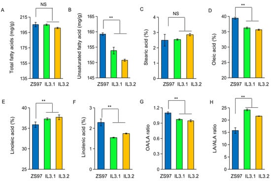Comparison of fatty acid content in the embryo between ZS97 and two introgression lines containing a particular OsFAD gene from Nipponbare, IL3.1 (OsFAD3-1NIP) and IL3.2 (OsFAD3-2NIP). (A) Total fatty acids (mg/g); (B) unsaturated fatty acid (mg/g); (C) stearic acid; (D) oleic acid (OA); (E) linoleic acid (LA); (F) alpha-linolenic acid (ALA, C18:3); (G) the OA/LA ratio; (H) the LA/ALA ratio. Values are means ± SE (n = 3 replications). Significance is indicated by t-test. ** p < 0.01, NS, non-significant.