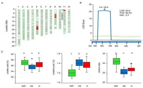 The genetic effect of OsFAD3-1 on unsaturated fatty acids in a segregated population derived from a cross of ZS97 and the introgression line IL3.1 (OsFAD3-1NIP). (A) Graphic genotype of IL3.1. (B) QTL mapping in the segregating population (n = 111); blue solid line, LA/ALA ratio; green dotted line, alpha-linolenic acid (ALA); red dotted line, linoleic acid (LA); LOD, logarithm of the likelihood of odds; PVE, phenotypic variation explained; Add, additive effect. (C) Differences of LA, ALA, and the LA/ALA ratio in the embryo of three genotypes assayed by the genic markers M3. Black dots in the boxplot represent outliers. NIP, homozygous Nippobare alleles; ZS, homozygous ZS97 alleles; H, heterozygote. Significant differences are indicated as different lowercase letters (a,b,c) by ANOVA.
