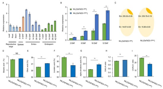 Expression analyses of OsFAD3-1 and differences in the unsaturated fatty acid content between near-isogenic lines, NIL(OsFAD3-1NIP) and NIL(OsFAD3-1ZS97). (A) Expression profile of OsFAD3-1 in various tissues of Nipponbare at the reproductive stage; DAF, days after flowering. (B) OsFAD3-1 expression in the spikelets of 3, 6, 10, and 12 DAF in NILs. The Ubiquitin as an internal reference. (C) Total of fatty acids (mg/g) in the embryo (Em) and endosperm (En) of NILs. (D–I) Relative contents of fatty acids in the embryo of the NILs, stearic acid (D), oleic acid (E), linoleic acid (F), alpha-linolenic acid (G). OA/LA, linoleic acid/oleic acid ratio (H), LA/ALA, linoleic acid/alpha-linolenic acid ratio (I). Values are means ± SE, and three replications were performed in each analysis. Significant difference is indicated by t-test at ** p < 0.01, NS: non-significant.
