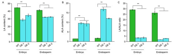 Overexpression (OE) of OsFAD3-1 in rice increased linolenic acid content. (A,B) The relative contents (%) of linoleic acid (LA), alpha-linolenic acid (ALA) in the corresponding samples, respectively; (C) LA/ALA ratio. Values are means ± SE. ** p < 0.01 against wild type (WT) by t-test.
