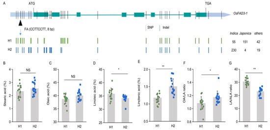 Two major haplotypes of OsFAD3-1 in rice germplasm (n = 263). (A) Schematic diagram of the gene showing relative locations of single nucleotide polymorphisms (SNP) and insertion/deletion (Indel). The relative location of diagnostic marker FA for the 8-bp Indel is indicated by arrows. (B–G) The average content (%) of stearic acid (B), oleic acid (C), linoleic acid (D), alpha-linolenic acid (E); and OA/LA, linoleic acid/oleic acid ratio (F), LA/ALA, linoleic acid/alpha-linolenic acid ratio (G), in the grains of representative haplotypes, H1 (n =15) and H2 (n = 15). Values are means ± SD. * p < 0.05, ** p < 0.01, NS, non-significant.