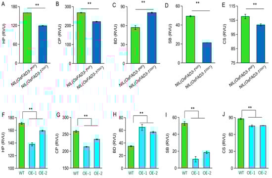 OsFAD3-1 is involved in starch pasting viscosity in milled rice. (A–E), differences between NILs in hold viscosity (HP), final viscosity (CP), breakdown (BD), setback (SB), consistence viscosity (CS), respectively; (F–J) differences in the values among OsFAD3-1 overexpression lines (OE) and wild type (WT). Values are means ± SE. ** p < 0.01 against WT by t-test.