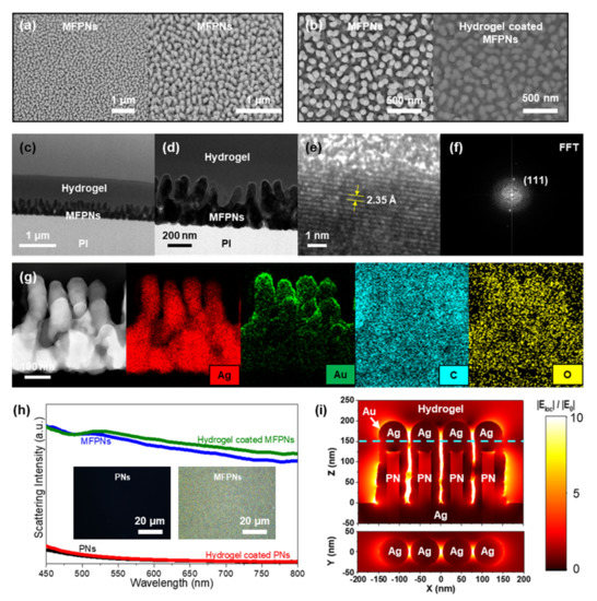 Morphological and crystalline analyses of the hydrogel coated metal film (Au/Ag) over polyimide (PI) nanopillars (PNs)(MFPNs). (a,b) FE-SEM images of the MFPNs without and with hydrogel encapsulation. Structural and crystalline properties of the hydrogel-coated MFPNs observed by (c,d) FE-TEM images, (e) HR-TEM image, and (f) the fast Fourier transform of the image in (e). (g) Compositional analysis with elemental mapping of Ag, Au, C, and O in the hydrogel-coated MFPNs. (h) Scattering intensity of the nonplasmonic PNs and plasmonic MFPNs with and without the hydrogel skin. The photograph of (h) demonstrates the true color of scattered light. (i) Numerically calculated E-field profiles of the hydrogel-coated MFPNs.