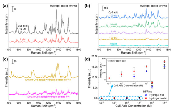 We investigated the SERS performance of the hydrogel-coated MFPNs by analyzing the quantitative Raman signals of the Cy5 acid (Figure 2a,b). The dye solutions were prepared over six decades of dilution (10 pM to 10 µM). The spectral intensity was gradually decreased with decreasing dye concentration. The characteristic spectral features of the Cy5 acid were clearly detected even at the low concentration of 100 pM. Among these features, the most intense peak at 1352 cm−1, corresponding to typical methine chain vibrations of indocarbocyanines [42,43], was attributed to a representative peak and was used for further analyses. The SERS EF of hydrogel-coated MFPNs was evaluated on the basis of the Raman intensity ratio between the plasmonic and nonplasmonic structures (Figure 2c). The EF was calculated by the following equation [7]: