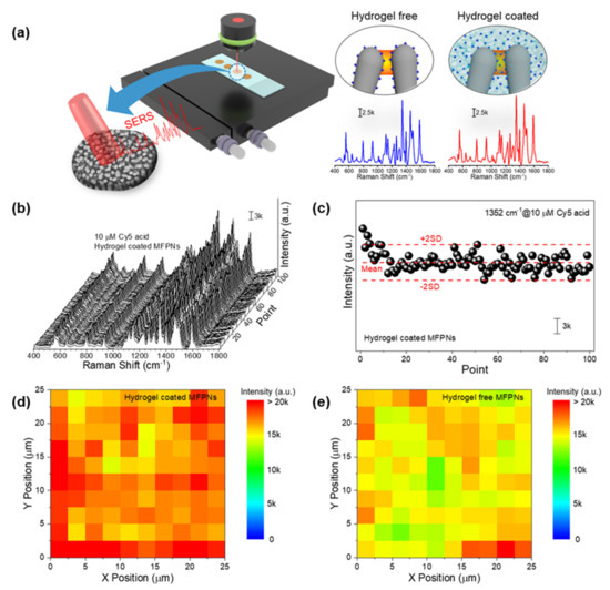 Practical assays require homogeneous SERS signals that arise from any random spot on a plasmonic structure. The spectra for Cy5 acid on MFPNs with and without the hydrogel skins were acquired using a Raman mapping image system equipped with an x–y stage remotely controlled by a computer (Figure 3a). The mapping scan was performed in an area of 25 × 25 μm2 in intervals of 2.5 μm (the interval should be larger than laser spot diameter of 1.9 μm). For the 10 µM Cy5 acid on hydrogel-coated MFPNs, the overall spectra (100 points) displayed high uniformity through the entire measurement range (Figure 3b). At the characteristic peak of 1352 cm−1, the Raman intensities were distributed within two standard deviations from the average (Figure 3c). On the basis of these intensities, the signals with a relative standard deviation (RSD) of 10.0% exhibited the excellent reproducibility of hydrogel-coated MFPNs. This was also confirmed in the reconstructed Raman mapping image in Figure 3d. For comparison, Raman mapping was also performed for 10 µM Cy5 acid on hydrogel-free MFPNs (Figure 3e). The Raman mapping for the hydrogel-free MFPNs indicated uniform signals with an RSD of 9.0%. This strong signal stability of MFPNs was attributed to the reasonably high periodicity of the PNs prepared by maskless plasma etching.