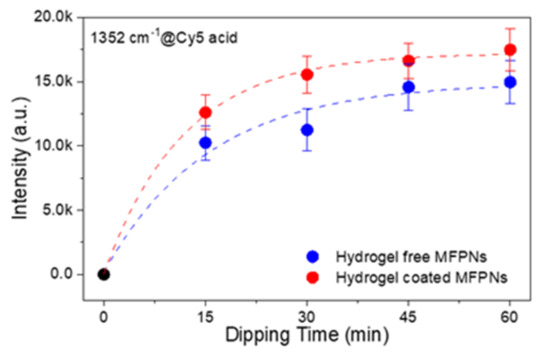 The SERS signals are proportional to the probe molecules adsorbed in the hotspots. For the MFPNs with and without the hydrogel layer, we optimized the dipping time to achieve high SERS performance in a relatively short time. The SERS intensities of the MFPNs with and without the hydrogel were measured at 1352 cm−1 after the MFPNs were immersed in 10 µM Cy5 acid solution for various times (t = 15, 30, 45, 60 min) (Figure 4). For both the MFPNs with and without the hydrogel matrix, with increasing dipping time, the peak intensity increased, whereas the slope efficiency (IRaman/t) was gradually degraded. The intensity almost reached saturation when the dipping time was 60 min. Therefore, the optimum dipping time was set to be 60 min. We also observed that the Raman intensity of the hydrogel-coated MFPNs was consistently higher than that of the hydrogel-free MFPNs because the hydrophilic hydrogel networks allowed the effective diffusion of dyes into the 3D volumetric hotspots.