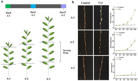 Experiment A: In this, 300 labelled plants were named A-1, A-2, and A-3 based on different treat times, respectively. A-1 was treated on June 18 (Day 0); A-2 was treated after 5 days (Day 5), and A-3 was treated after 11 days (Day 11) following A-1, respectively (Figure 1). Intact stocks were sprayed once with 0.2 g/L CYC, and controls were sprayed with the exact solutions without CYC. The length of axillary buds was measured every 4 days initiating treatments using a digital calliper. Axillary buds of treated stems were collected for subsequent phytohormones measurement and total RNA extraction with three biological repeats. A single repeat included sampling from 10 plants containing 40–60 axillary buds. The concentration of 0.2 g/L CYC was chosen based on our laboratory research [53]. CYC was dissolved in 0.5% DMSO plus 0.2% TWEEN20.