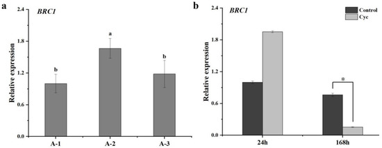 Overview of the BRC1 expression level using qRT-PCR. (a) The BRC1 expression level among the different maturity state axillary buds at 0 h with A-1, A-2, and A-3 materials (b) The BRC1 expression level after cyclanilide (Cyc) treatment at 24 h and 168 h with A-1 material. Significant differences analysis based on the Tukey test in (a) and t-test in (b) (* p < 0.05). Data represent the mean ± SD (n = 3).