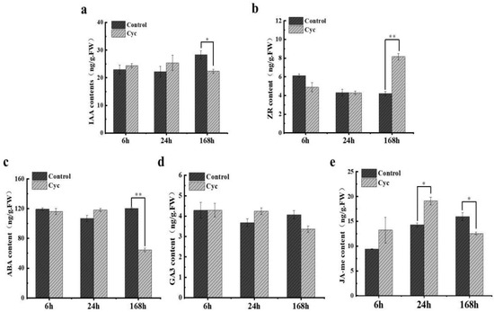 Hormone content in axillary buds at 6–168 h after application of cyclanilide. (a) IAA (indole-3-acetic acid) content (b) ZR (zeatin riboside) content (c) ABA (abscisic acid) content (d) GA3 (Gibberellin 3) content (e) JA-me (methyl jasmonate) content. Cyc: cyclanilide. Data represent the mean ± SD (n = 3). Asterisk indicates significant differences based on a t-test (p < 0.05). Double asterisks indicate extremely significant differences based on the t-test (p < 0.01).