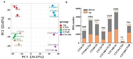 To investigate the molecular basis and potential pathways related to the promotion of branching by CYC, a transcriptome profiling experiment using RNA-Seq was conducted on axillary buds at 24 and 168 h after CYC treatment with A-1 material. Principle component analysis demonstrated clear differentiation among the control and treatment groups and affirmed clustering of samples from the different time points. Up to 24 h, the samples were not clearly differentiated between the control and treatment groups. However, by 168 h, the two groups were distinct (Figure 4a). The Q30 of the clean reads was between 93% and 93.98% in all the experimental samples. The unique map ratio was between 89.83% and 90.46% in all the collected samples (Supplementary Materials Table S1).